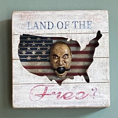 The artist deconstructed a patriotic wall décor, and reassembled it to house the face of a screaming man. The man’s screams have been silenced with a ball gag she sculpted. She added a question mark to the words that already were written on the item, making the statement of “Land of the Free” into a question.