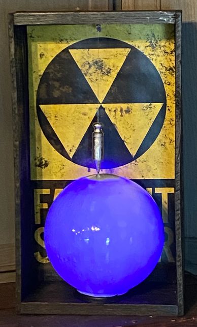 The artist stained an old crate black to house the planet earth, which was once a ceiling light. A small bulb inside illuminates the earth’s blue glow. A simple plumb bob dangles precariously above it, representing the nuclear missile that will subsequently destroy the earth. The background is a sign, reminding us all of the nuclear fallout that will occur after the earth is blackened by nuclear war.
