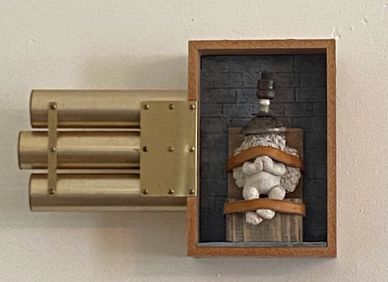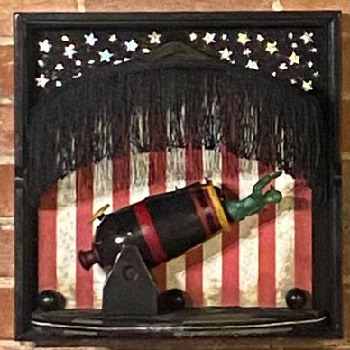 Rather than explicitly portray military cannons, the author instead chose a circus cannon for this piece. She intermixed circus elements with those of war, so that it becomes difficult to distinguish the two. A circus can be seen as a frivolous source of entertainment and profit that exploits its human and animal workers, in much the same way that war can. She wanted to represent the chaos of war with the nonsensical chaos of a circus, to stimulate thought about the necessity of war.