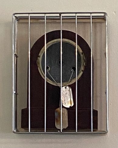 The artist took a very abstract approach to this piece. Rather than using a human form, she chose a clock to represent the soldier. The clock is missing its hands and its face, and it is housed in a cage. This is in reference to the song’s lyrics of “body my holding cell.” The military dog tags provide the one touch of realism to the assemblage, reminding the observers that the subject is a soldier. The tags are imprinted with the total number of American casualties of war since 1776 (as of July 2021).
