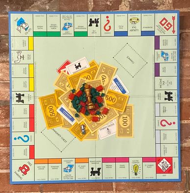 The artist wanted to build on that theme of striving towards material gain and its meaninglessness. Materialism can have people figuratively spinning in circles without every achieving anything. So, for this piece, the art is mounted on a bearing that allows it to spin. The basis of the piece is a Monopoly board, since it signifies the meaningless quest for accumulating wealth. At its center, is a chess king, atop his pile of “riches.”