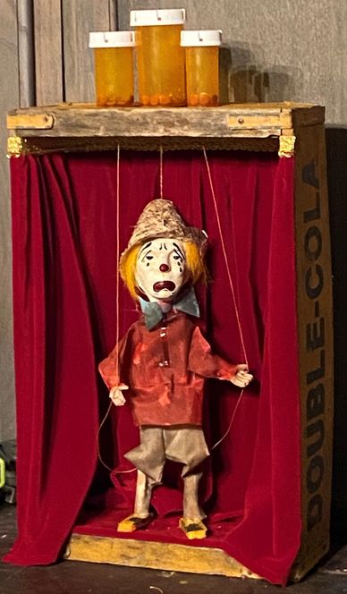 Although the drug referred to in the lyrics seems to be cocaine, the artist chose prescription opioids as the drug that is the master of this puppet. Opioid abuse is leading to massive social issues, and the root of the issue is in prescription drug misuse. For this interactive piece, housed in an old Double-Cola crate (which is a nod to the artist’s town of residence), one can lift the two outer bottles to control the marionette’s arms.