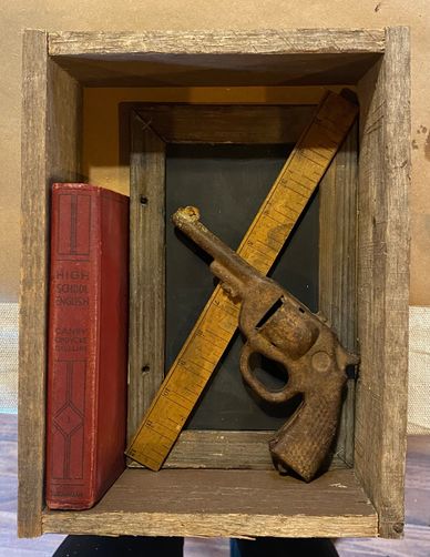 The artist chose to build on this theme of school shootings by creating a simple assemblage filled with vintage items. The box is constructed from salvaged pallet boards. The background is a chalkboard, next to a text book from the 1930’s. Along with a ruler, sits a vintage toy gun that represents the actual guns that are now more common in schools than actual chalkboards.