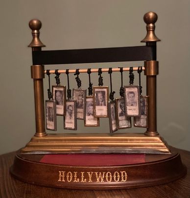Since some members of the Hollywood Ten were Oscar winners, including Dalton Trumbo (author of Johnny Got His Gun), the artist wanted to represent that glamour of old Hollywood in this sculpture. The red represents not only the red carpet of Hollywood, but also the Communism that was so feared. Metallica described this as a witch-hunt, so the artist hung photos of the men from tiny nooses, as if they were lynched for their ‘crime” of sharing a different viewpoint. The photos all appear to be covered with ice and snow. This is a nod to another Metallica song, “Trapped Under Ice,” that describes loneliness and isolation. These men had their careers frozen and were alienated from the lives they had once known