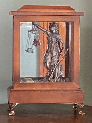For this assemblage, the artist modified a 3-D print of Lady Justice. She has her standing on a pile of skulls, and her scales of justice are imbalanced with money and a human heart. She is housed within a wood and glass clock case, which represents the polished appearance of the US criminal justice system. As a literal reference to the song, she included apathy as a stepping stone.